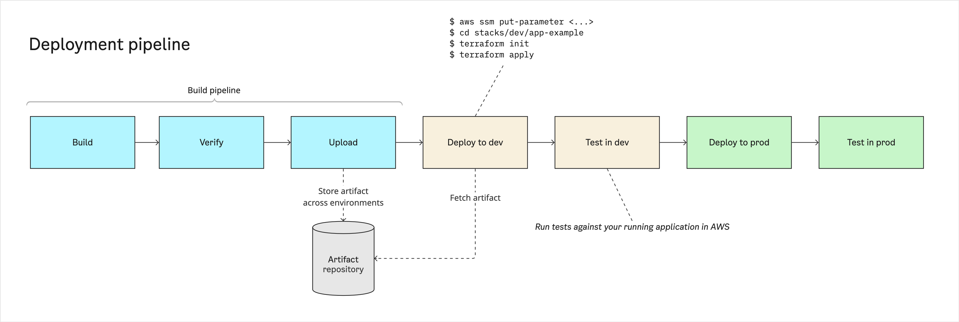 stacks/dev/app-example). - The pipeline stores a reference to the new artifact in AWS Systems Manager Parameter Store and runs